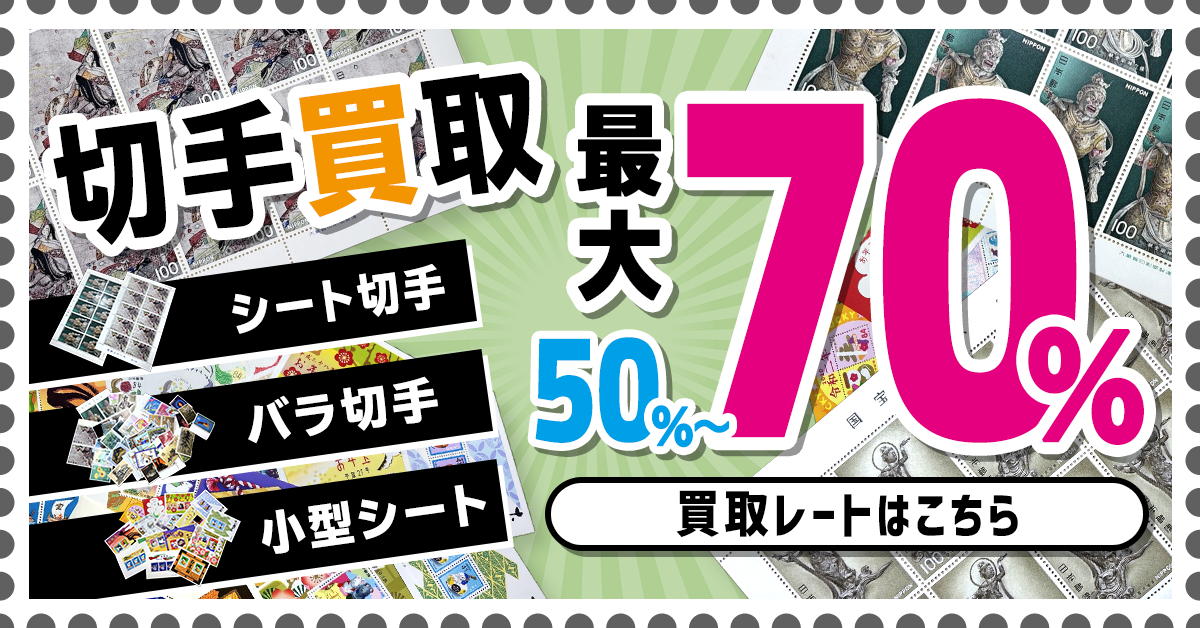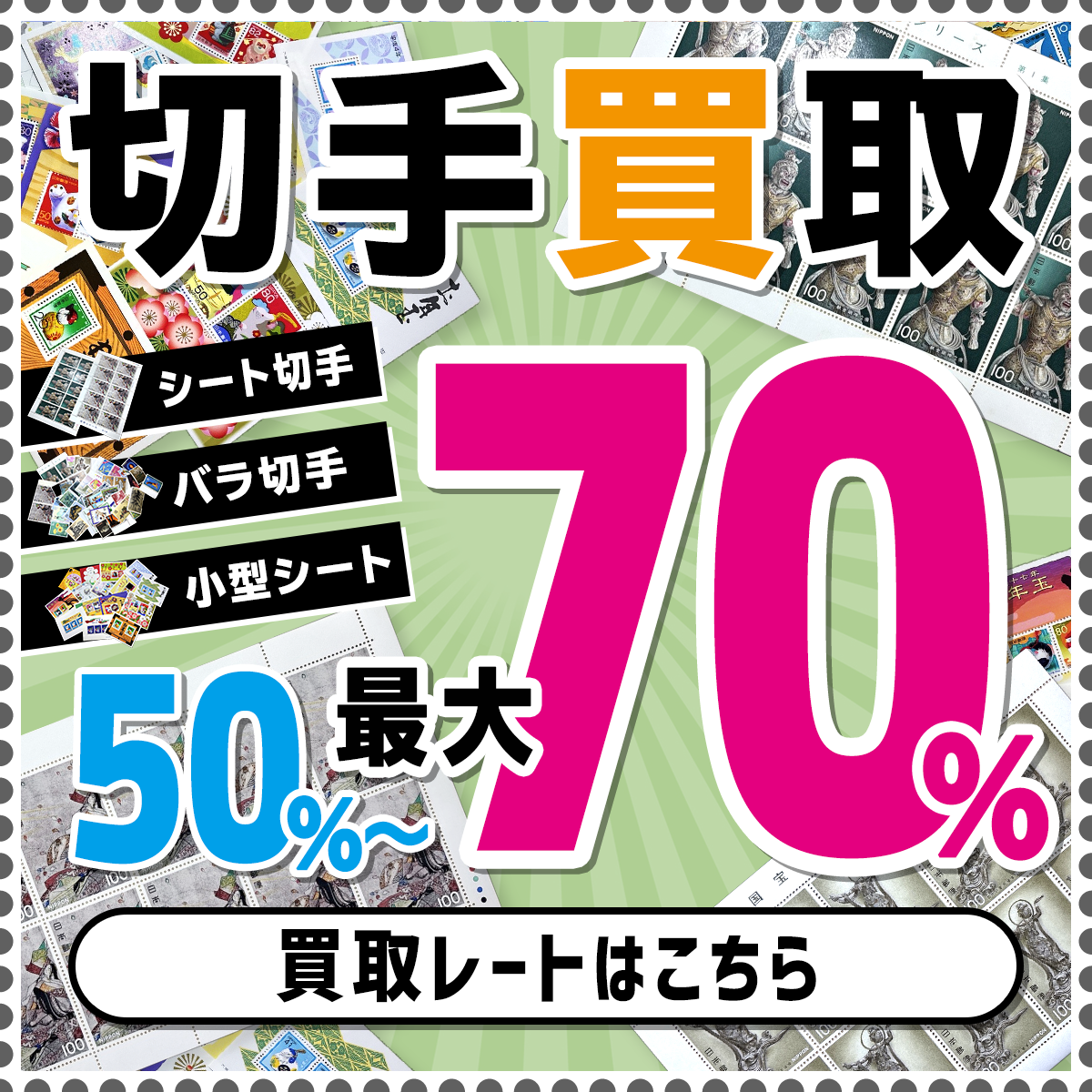 | 【額面50円以上シート】 ・10面以上で構成。 ・四辺の白枠のある物。 額面50円以上が対象 (例:50円・62円・80円・90円など) 【シール式除く】 【額面混合除く】 |